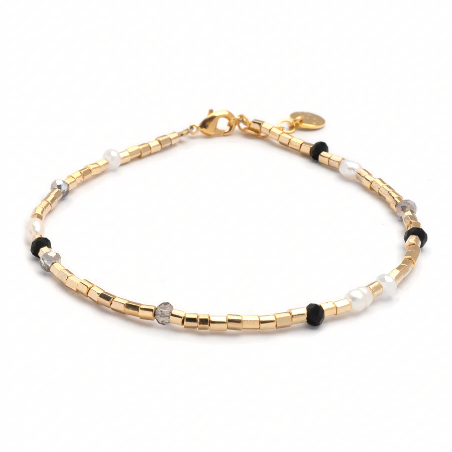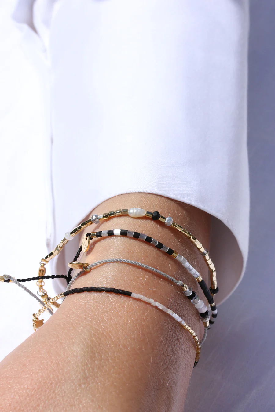 Goldene Metallic-Perlen und elegante Highlights in Crystal Grey, Metallic Grey und Schwarz machen das Capri-Armband Satin zu einem festlichen Begleiter an deinem Handgelenk. Drei kleine Süßwasserperlen mixen einen Schuss Insel-Feeling dazu.