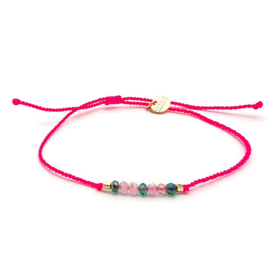 An dem zarten Nylon-Bändchen in Neon Pink funkeln sieben facettierte Kristallperlen in den Farben Blush Rose, Aqua Blue und Hellgrau. Eingerahmt ist der elegante Farb-Mix von zwei Goldperlen. Dezenter lässt sich dein Handgelenk kaum schmücken.