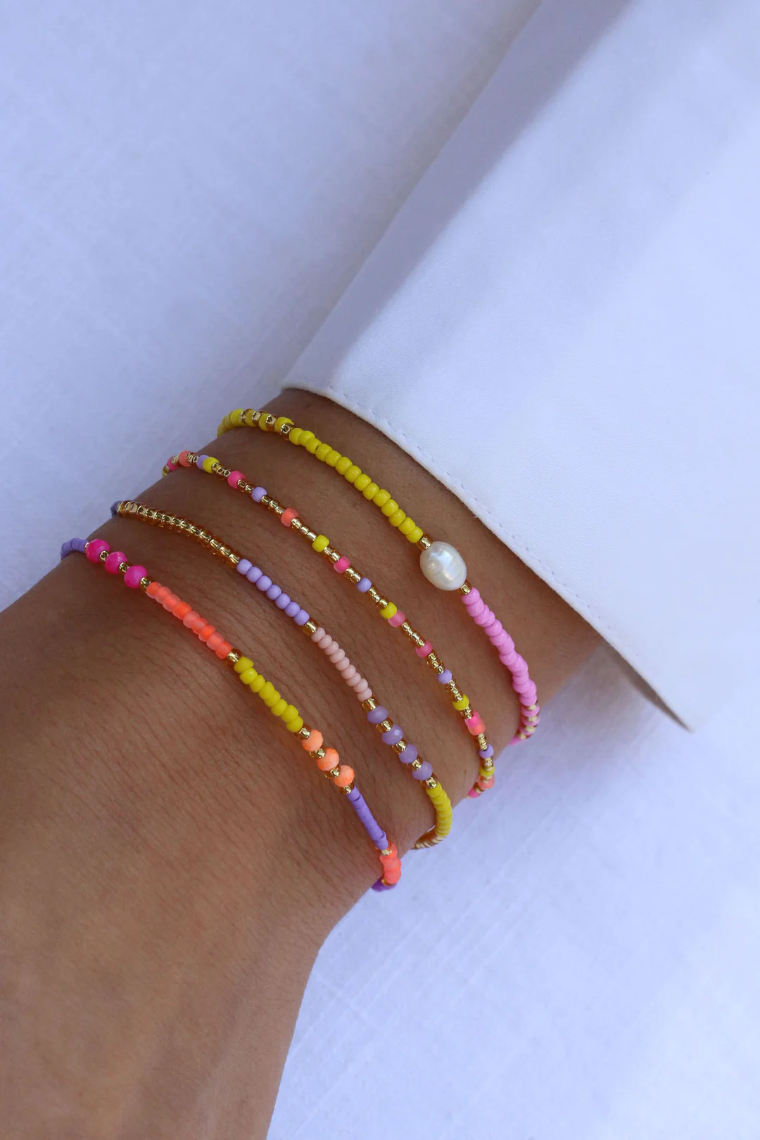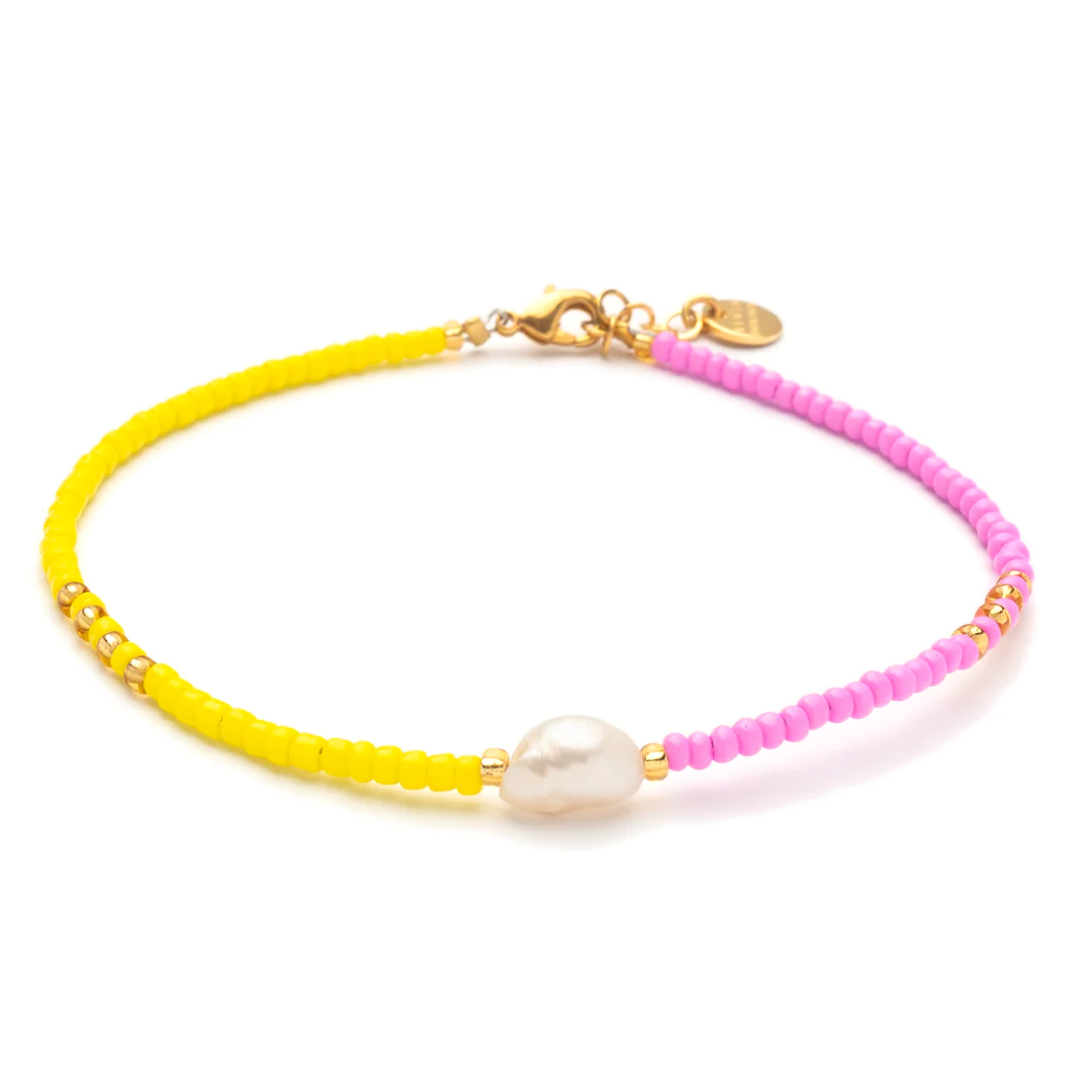 Das Armband Bora Bora aus unserer Isola-Serie ist ein zweifarbiger Pastell-Mix im zeitlosen Design: Die eine Hälfte des Armbands besteht aus matten Perlen in Zitronengelb, die andere Hälfte besteht aus matten Perlen in Fuchsia Pink. Eine Süßwasserperle ist der strahlende Mittelpunkt, eingerahmt von vereinzelten goldenen Perlen.