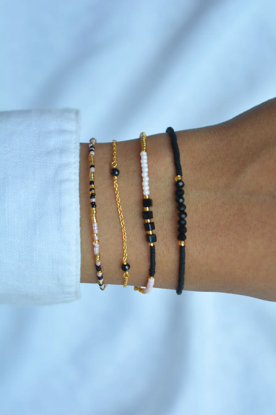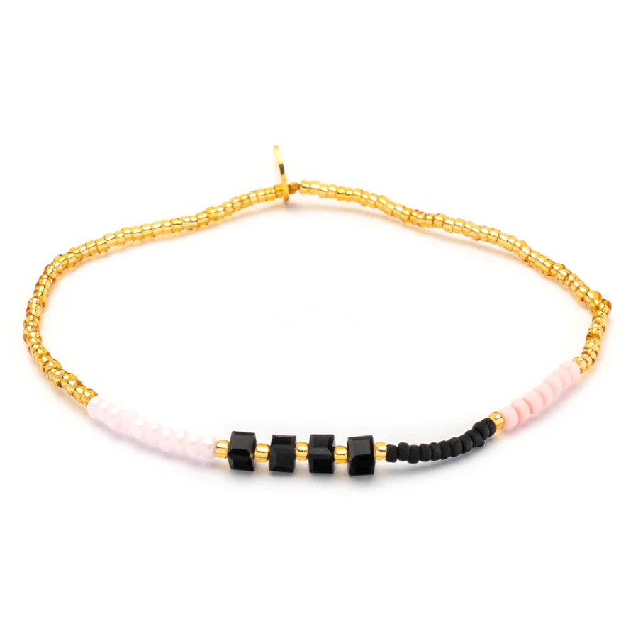 Das goldene Armband Mosaic in Black Rose kombiniert matte Roccailles-Perlen in Blush Rose und Schwarz. Vier schwarze Glaswürfel bringen zusätzlichen Glanz ans Handgelenk.