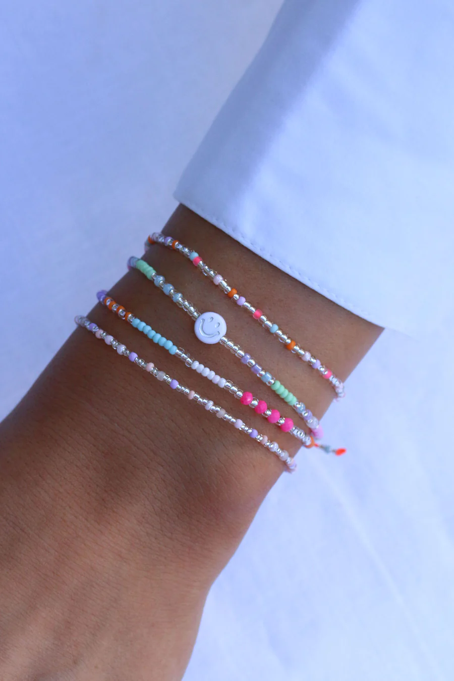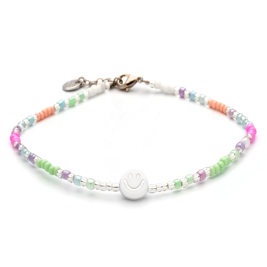 Das silberne Armbändchen Smile, it’s your Birthday ist der Zuckerguss auf deiner Geburtstagstorte: Mattweiße Perlen und bunte Roccailles Perlen in den schönsten Bonbon-Farben versüßen dein Handgelenk und wechseln sich mit silbernen Perlen ab. In der Mitte strahlt dich eine Smiley-Perle an. Wir haben weitere Varianten des Birthday-Bändchens im Repertoire.