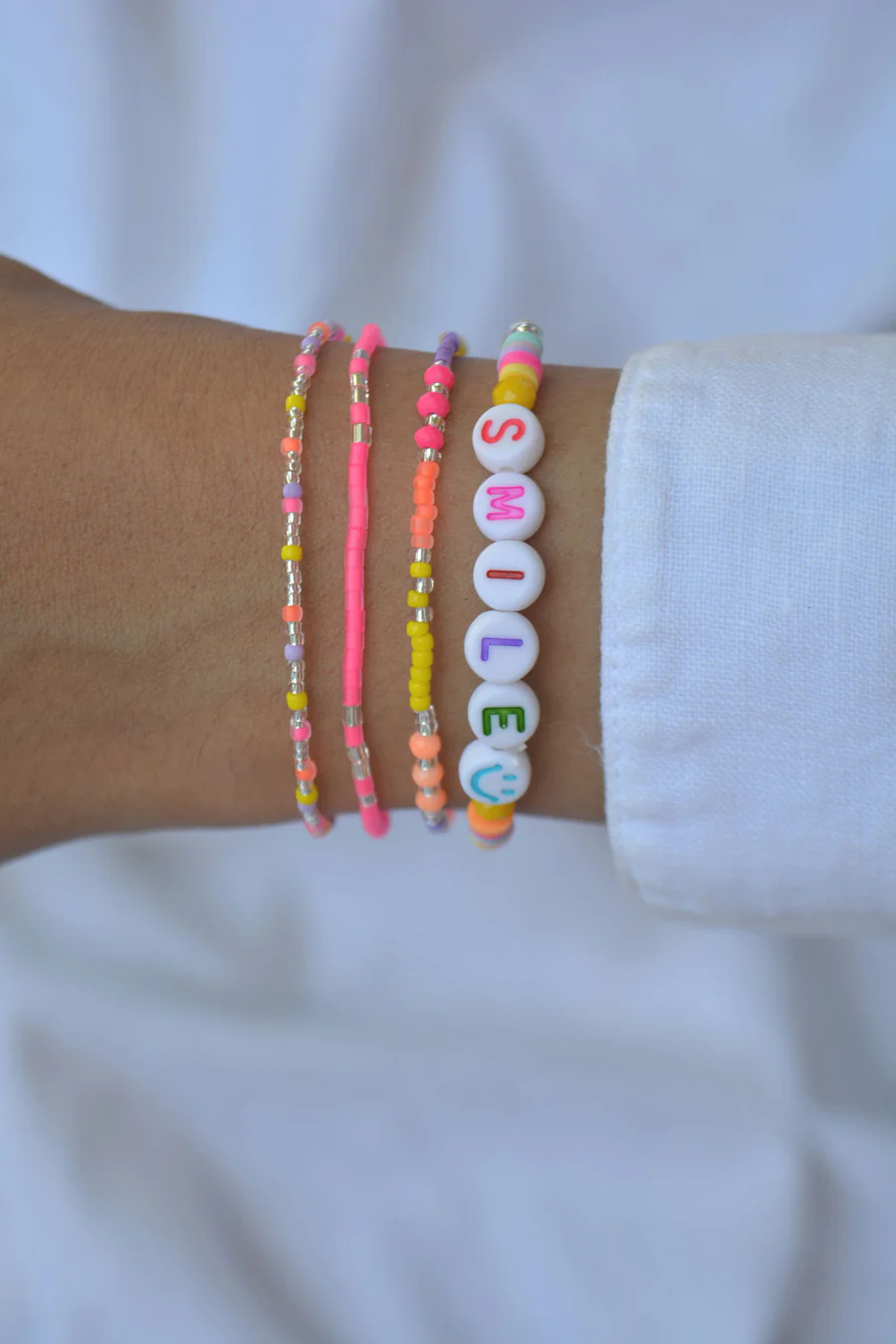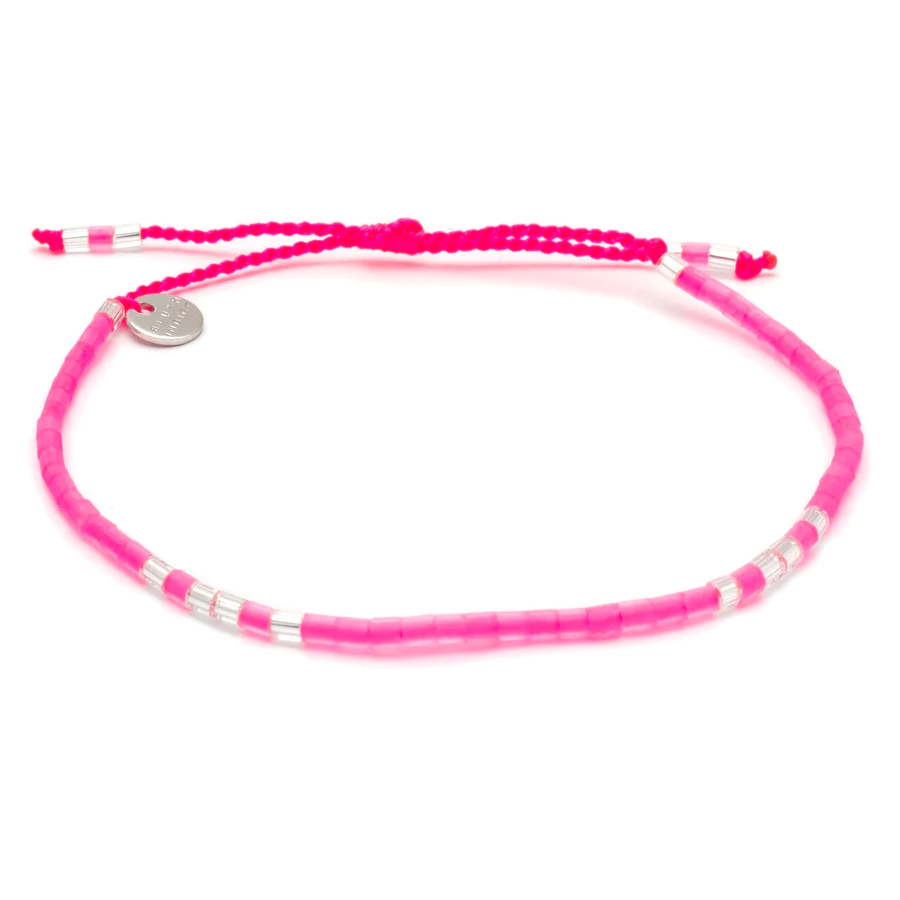 Hier strahlen Bändchen und Perlen in einem kräftigen Neon Pink. Vereinzelte silberne Perlen sorgen für zusätzliche Akzente. Das pinkfarbene Nylon-Band hat einen verstellbaren Knotenverschluss, mit Perlen verzierte Endstücke und ein Logo-Plättchen.