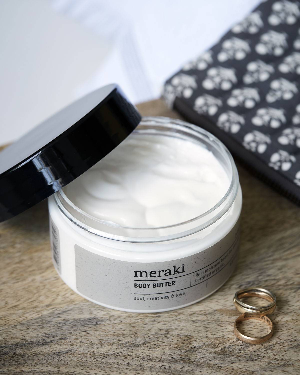 Diese Body Butter mit Bio-Zertifikat von Meraki hinterlässt ein weiches und geschmeidiges Hautgefühl, ohne zu fetten. Aloe vera, Sheabutter und zahlreiche nährende Öle aus Mandeln, Sonnenblumen und Oliven spielen hier perfekt zusammen, um deine trockene Haut zu beruhigen und sie mit der dringend nötigen Feuchtigkeit zu versorgen. Die Bodybutter wurde mit dem Duft Silky Mist versehen, der Noten von weißen Zitrusblüten aufweist. Bodybutter sanft in die saubere und trockene Haut einmassieren und so oft wie nötig verwenden. Die Body-Butter wurde mit dem Biokosmetik-Label Ecocert Cosmos ausgezeichnet