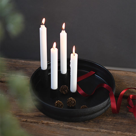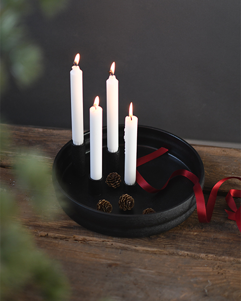 Ein stilvoller Kerzenständer mit vier Kerzen, der überall platziert werden kann. Man kann ihn mit Zweigen, Steinen und Muscheln wunderschön dekorieren. Der Kerzenständer ist aus matter Keramik.