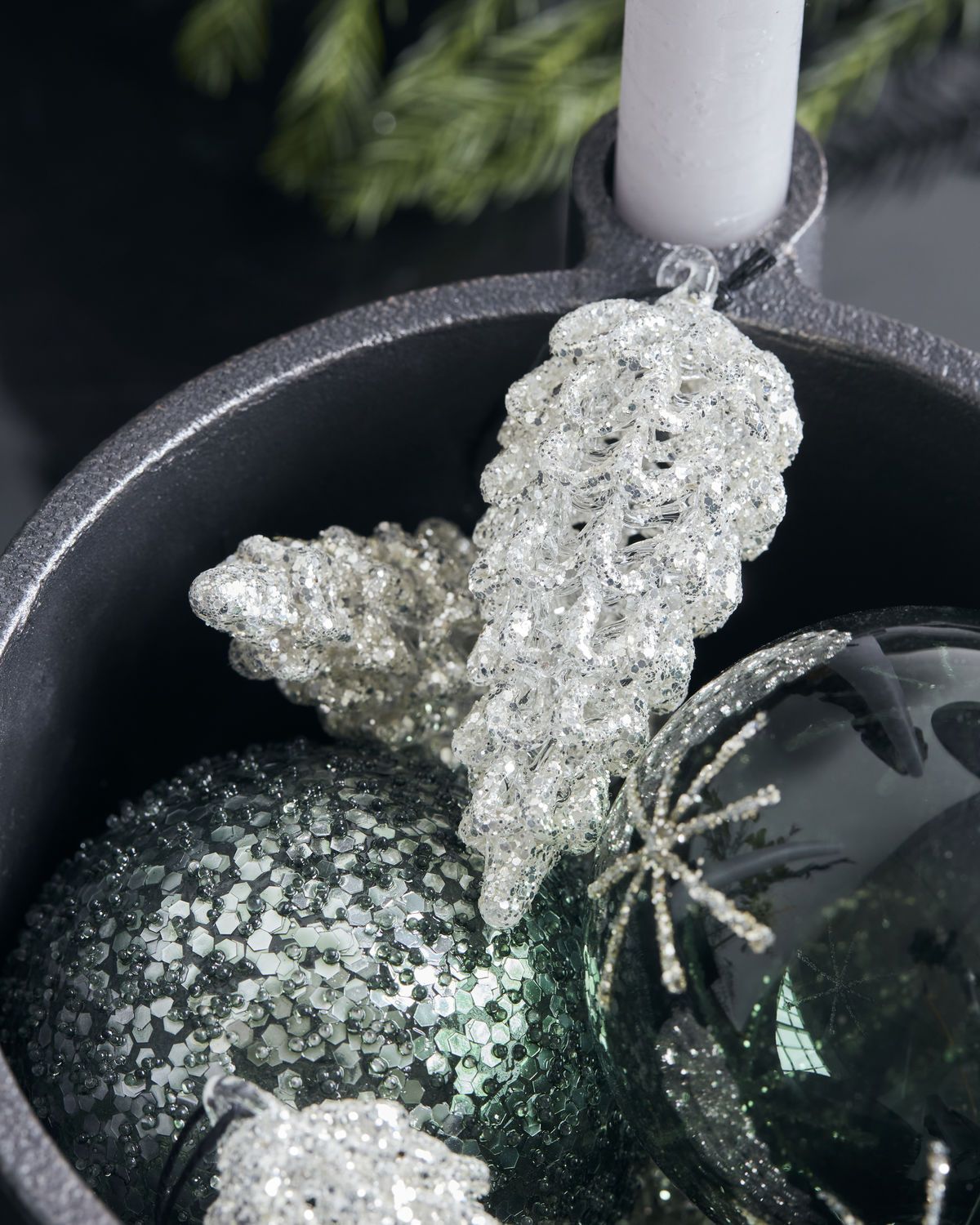 Gold und Glitzer – eine klassische Kombination und fester Bestandteil einer jeden Weihnachtsdekoration. Dieser silberne Tannenzapfen namens Cone sorgt für ein Funkeln am Weihnachtsbaum. Kombiniere die Glaszapfen mit Metall-Anhängern und Pappmaché-Kugeln in Hellbraun, Beige oder Sand, um einen perfekt abgestimmten Ton-in-Ton-Look zu erzielen. So wird der Baumschmuck mit verschiedenen Materialien und Texturen perfekt ausbalanciert. Alternativ kannst du die Tannenzapfen auch an einen Tannenzweig präsentieren, der in einer Bodenvase steht oder von der Decke hängt. Auch in Gold verfügbar.