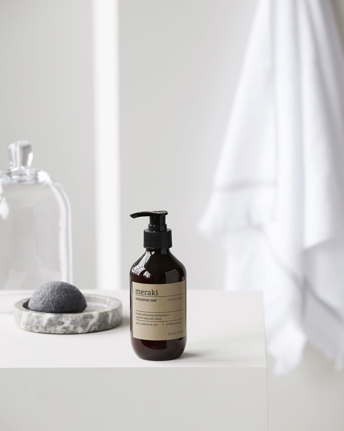 Exfoliating Soap ist eine sehr leichte Seife mit sanftem Schrubbeffekt, die die Haut weich, glatt und nicht zuletzt aromatisch hinterlässt. Wenn Sie keine schweren und vollen Ölpeelings mögen, ist dieses Mehrzweckpeeling von Meraki mit seinem Duft von Northern Dawn eine wunderbare Alternative. Es kann zum täglichen Händewaschen und unter der Dusche verwendet werden. Das feine Aprikosengranulat und die sanft scheuernden Reiskörner entfernen abgestorbene Hautschüppchen und reinigen die Haut sanft. Die Seife ist für alle Hauttypen geeignet.