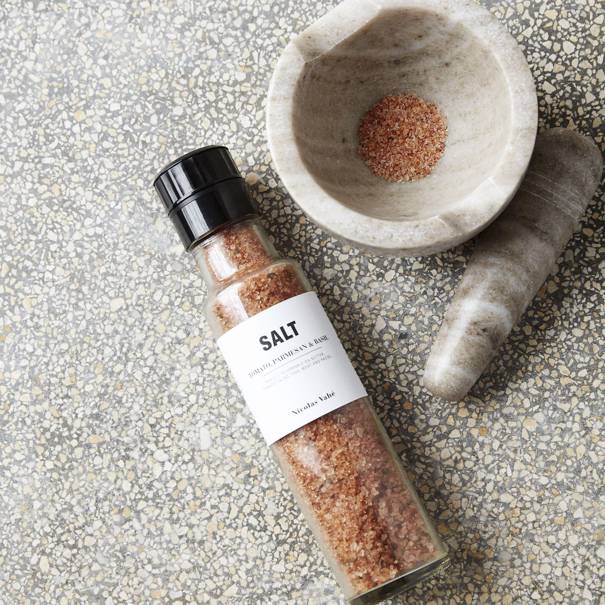 Dieses Salz von Nicolas Vahé wurde durch eine Kombination aus Tomate, Parmesan und Basilikum ergänzt, die die hübsche rote Farbe verleiht. Die praktische und dekorative Salzmühle lässt sich perfekt als Blickfang in der Küche oder auf dem Esstisch in Szene setzen. Das Salz eignet sich besonders gut zum Verfeinern von Butter, Tomatensalat, Fisch, Fleisch und Pasta. Die Mühle erleichtert das Würzen beim Kochen, sodass Sie die leckere Geschmackskombination in sämtlichen Gerichten genießen können. Nach dem Öffnen innerhalb von 16 Monaten aufbrauchen.