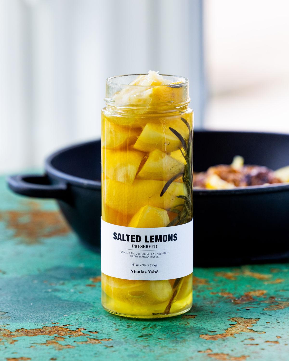 Verleihe deiner Tagine und deinen Fisch- und Mittelmeergerichten mehr Würze mit den gesalzenen Zitronen von Nicolas Vahé. Vielleicht kennst du sie noch nicht, aber wenn doch, wartet ein ganz neues Geschmackserlebnis auf dich. Eingemachte Zitronen haben einen pikanten, nicht ganz süßen aber dennoch fruchtigen Biss, der allen Gerichten Salz und Säure verleiht. Alles – die Schale und das Fleisch – ist essbar. Einfach die Zitronenscheibe spülen, zerschneiden und in den Salat geben für einen salzigen Kick und einer schönen Farbe. Oder benutze sie zum Verfeinern von klassischer Hühner-Tagine, in selbstgemachtem Humus, Eintöpfen oder sogar Fischcurry. Wenn du die Zitronen nicht benutzt, sind sie im Glas ein farbenfroher Hingucker auf dem Küchentisch und sie gehören deshalb bestimmt nicht in den Küchenschrank.