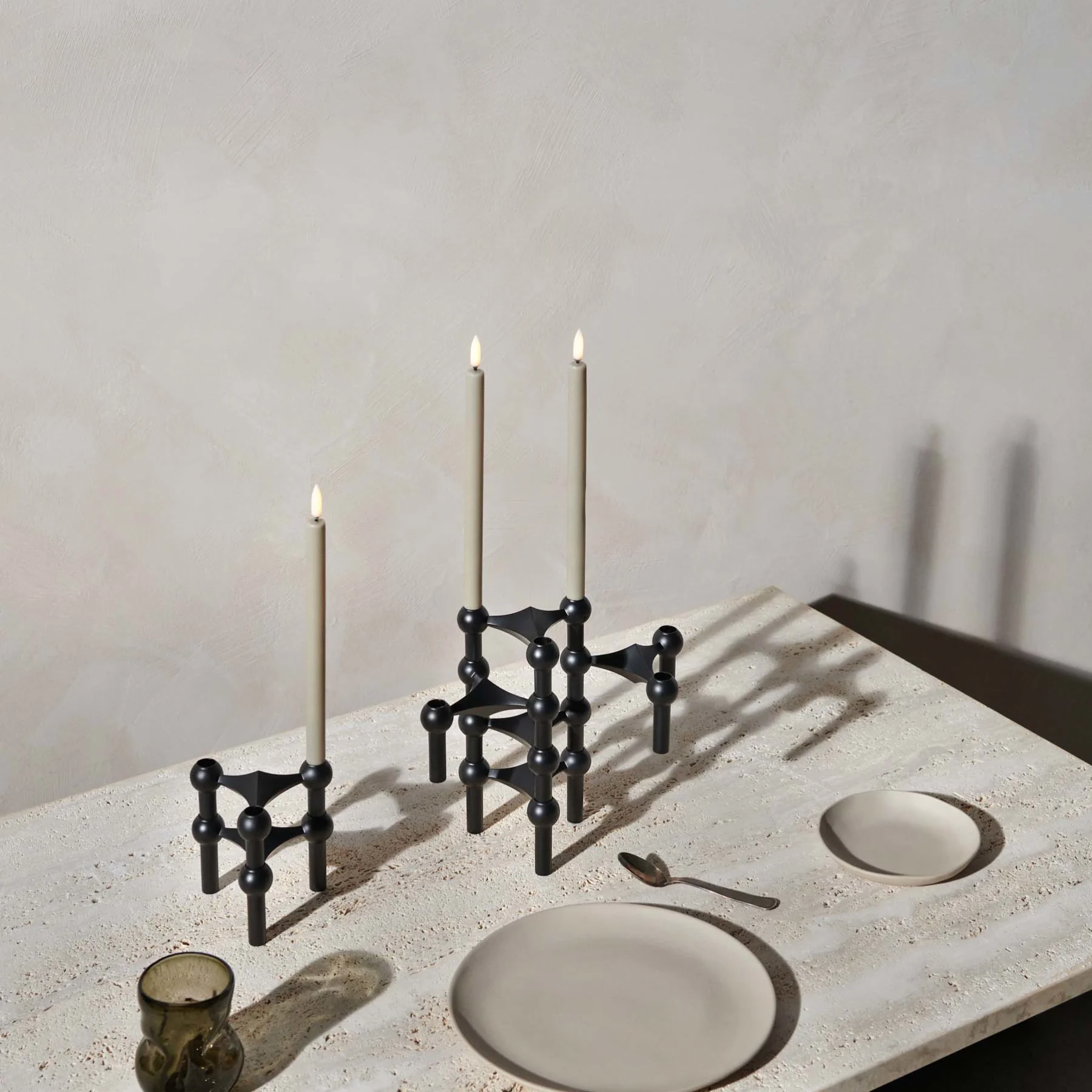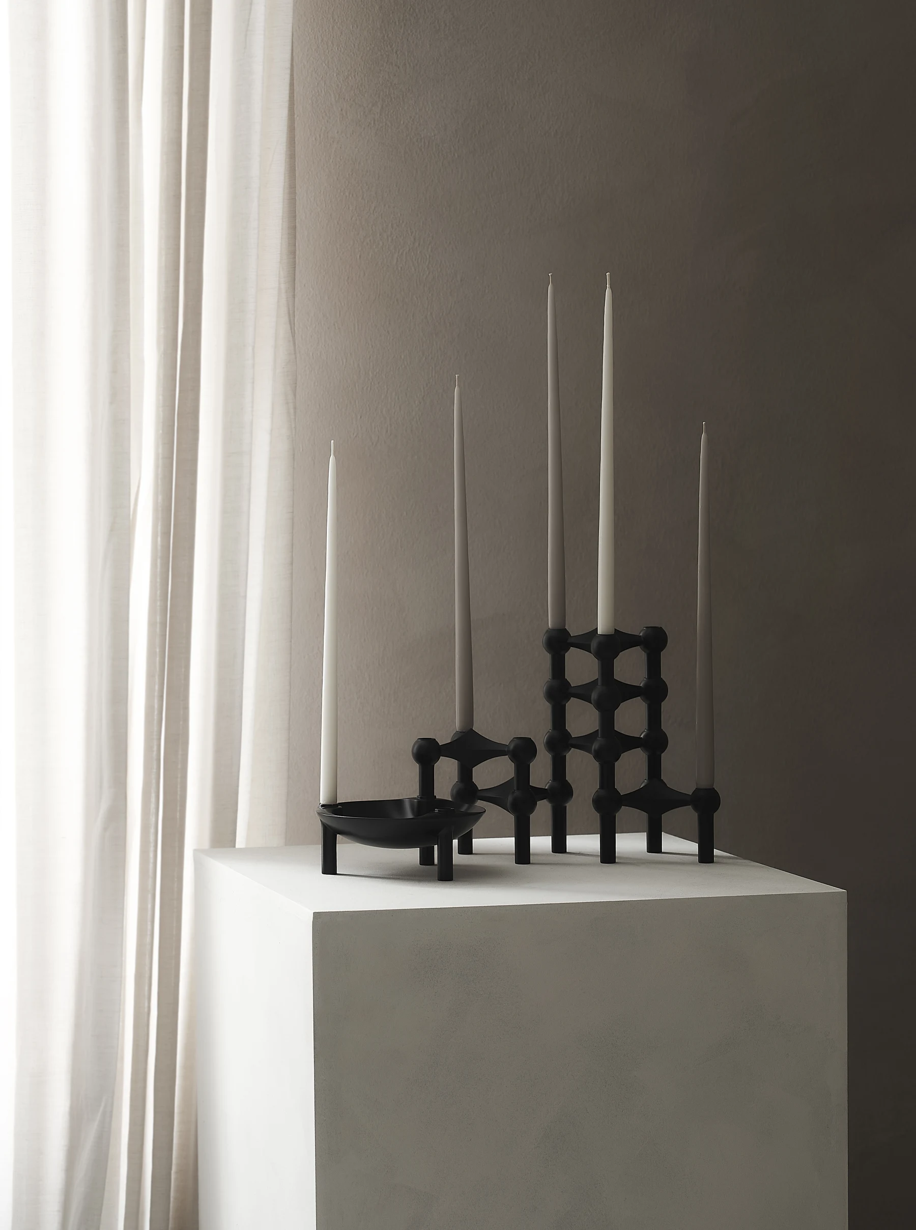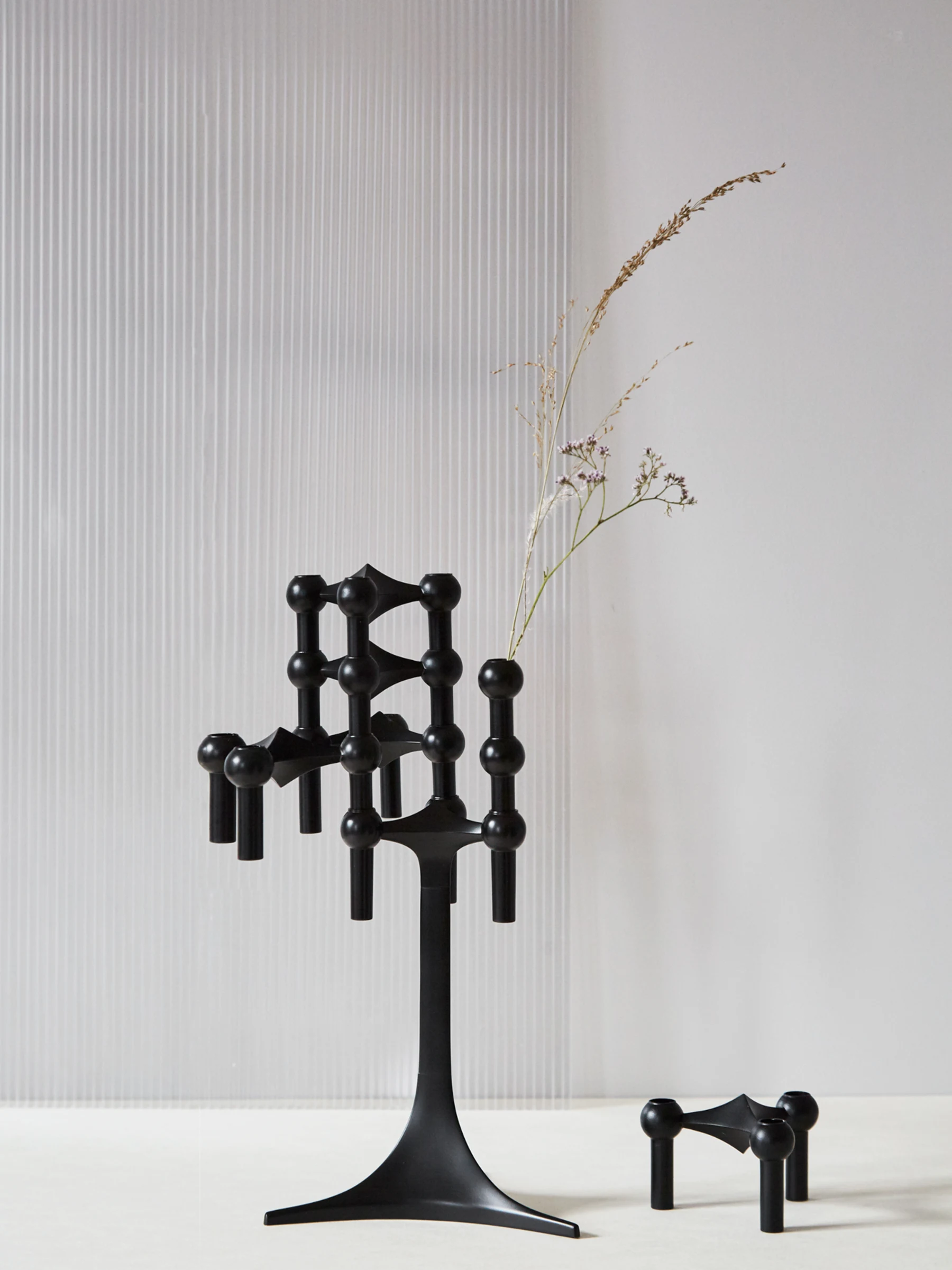 Die mattschwarze Farbausgabe ist eine moderne und rohe Variante des klassischen STOFF Nagel Kerzenhalter-Designs. Es gilt als Kunstwerk – ein persönliches Statement und eine formbare Skulptur, die bereit ist, die Form der einzigartigen Kreativität ihres Besitzers anzunehmen.