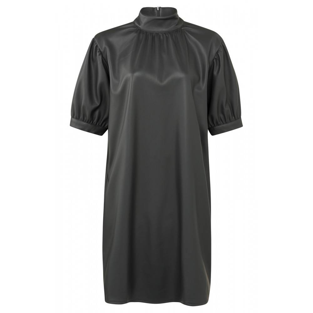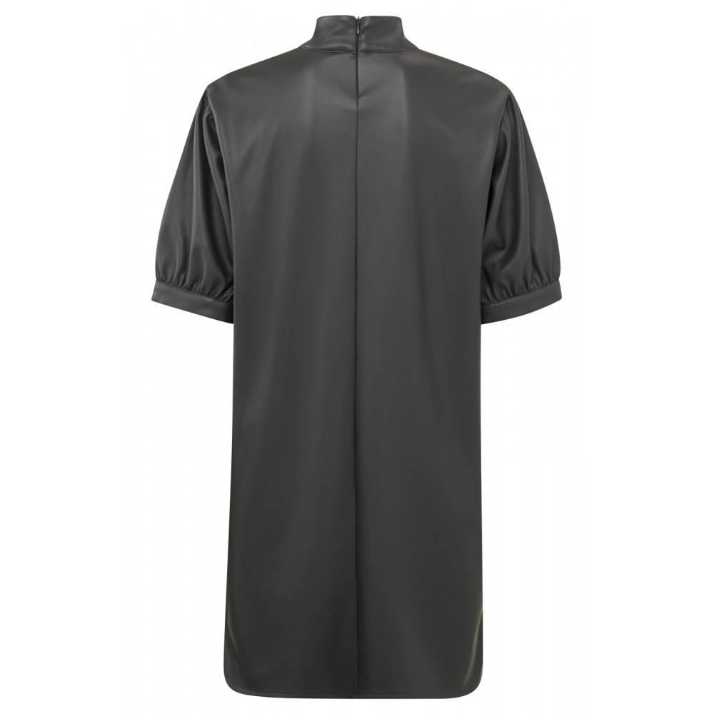 Kleid im Lederlook mit Stehkragen, kurzen Puffärmeln und Reißverschluss am Rücken.
